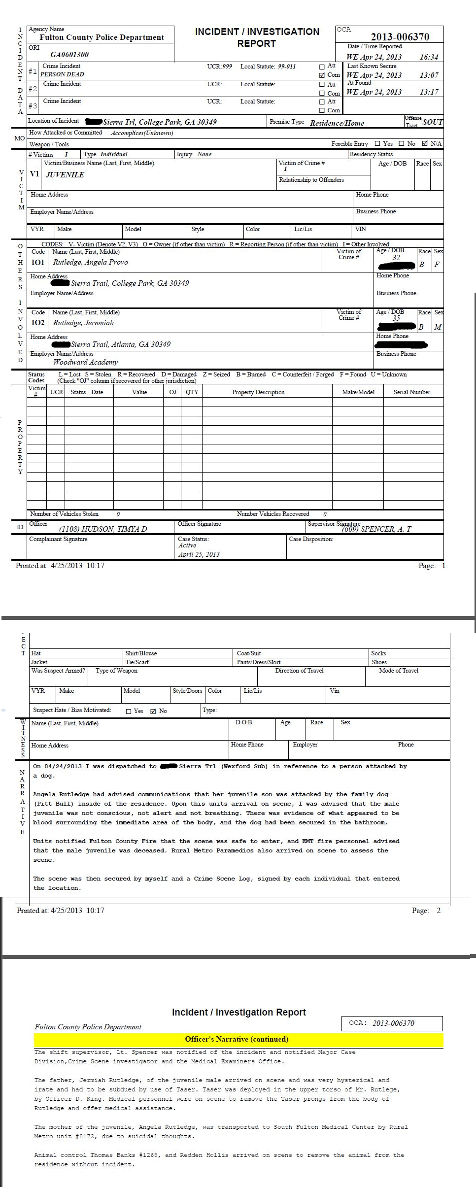 Beau Rutledge, 2-years old, was savagely mauled to death by his family's pit bull at his Wexford subdivision home. The boy's mother, Angela Rutledge, told police she went to the bathroom and came back to find Beau terribly injured and dead from the vicious attack. Police, emergency medical personnel and news media swarmed the cul-de-sac street. Neighbors called the scene "surreal." First responders said the scene was "horrible," so gruesome that police hung a sheet over the doorway of the home to keep it hidden from view. "I felt like I was in a horror film," said one neighbor who briefly saw inside of the home. The family had owned the female pit bull, named Kissy Face, for eight years. Though identified as a pit bull numerous times, including by police and Fulton County animal services, the American Journal-Constitution began calling the dog an "American Staffordshire terrier-mix," an alias for the pit bull terrier for over 40-years, and thus is always included in the legal definition of a pit bull. [source citations]