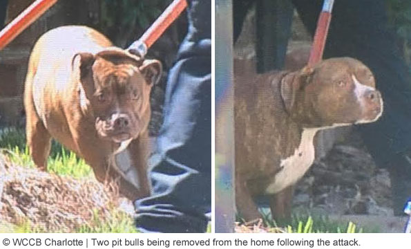 Bessie Flowers, 86-years old, was fatally attacked by her daughter's two pit bulls. The attack occurred just before 1:00 pm, while she was visiting her daughter's residence in 3200 block of Luke Crossing Drive. Flowers was on the back porch heading inside when she slipped or tripped onto the dog bed. The two pit bulls approached Flowers and began "playing with her," sources said. This turned into aggression, which rapidly escalated. The daughter was able to pull the dogs off Flowers and call 911. In a gasping voice, she told dispatchers, "This is an emergency. My dogs attacked and really hurt her. Please come!" The dogs mauled her face and neck causing "fatal injuries," officials said. She died at the scene. Because the daughter did not want to surrender her pit bulls to authorities, Charlotte-Mecklenburg Police Animal Control seized them. Both pit bulls, a male and female, were later euthanized. No autopsy was performed because the cause of death was "clear" as "blunt force neck injuries due to dog attack," the medical examiner's office said. [source citations]