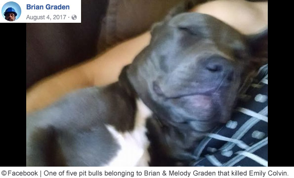 Emily Colvin, 24-years old, was killed by her neighbor's five pit bulls. The dogs also attacked a relative who came to her aid. Jackson County sheriff’s deputies were dispatched to County Road 121 in Section at about 9:00 am. Deputies found Emily dead on arrival. The dogs "chewed that poor girl to pieces," one first responder said. A deputy shot one of the pit bulls, killing it. Police confiscated four other pit bulls involved in the attack. The other victim, Emily's relative, received treatment for her injuries. She had been talking to Emily on the phone when she heard the dogs attacking. Emily's newlywed husband was away at the time. Tiger Frazier, Emily's friend, said she had complained about the dogs to her coworkers before the attack. The same dogs had killed llamas in a nearby field some time ago, Sheriff Chuck Phillips said. Her death inspired a state felony dog attack law, "Emily's Law. In April 2018, Brian Graden, 43, and Melody Graden, 45, were charged with criminally negligent homicide, a misdemeanor, in connection to her death. [source citations]