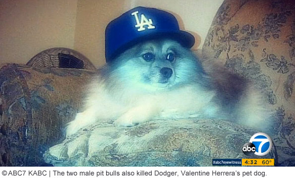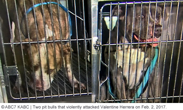 Valentine Herrera, 76-years old, was savagely attacked by two pit bulls and died nearly one month later. The attack occurred on February 2, around 5:45 pm in the 2600 block of North Lincoln Park Avenue, according to the Los Angeles Fire Department. Herrera was walking his pomeranian, "Dodger," when the pit bulls escaped their property and attacked Dodger, killing him. When Herrera intervened, the pit bulls attacked him. The dogs knocked him to the ground and tore into his flesh. Herrera was transported to LA County-USC Medical Center where he underwent brain surgery. He remained in critical condition until he died on February 27. Neighbor Frank Carrasco, who witnessed the violent attack, said the owner of the pit bulls did not attempt to help the elderly man sprawled on the ground and bleeding afterward. Animal control officers took custody of both pit bulls, described as males between the ages of 2 and 3. Several days before the attack, the same pit bulls killed a neighborhood dog belonging to Stephanie Grezelle in front of her two children. [source citations]