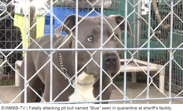 Alicia Malagon, 76-years old, was killed by a pit bull she was dog-sitting. The attack occurred during the night, before 1:30 am, after she brought her own dachshund to her daughter and son-in-law's home in the 22000 block of Northwest Lamont Road. Once there, a pit bull named "Blue" attacked her dog. When she tried to separate the two, the pit bull attacked her. When Calhoun County sheriff's deputies arrived, they discovered a "significant blood trail" leading from a bedroom to the kitchen, where they found Malagon unresponsive in a large pool of blood. She was bitten in several places, but "most noticeably was her right leg, which sustained extremely deep and large lacerations," deputies wrote. Malagon was able to crawl to a phone and call her son-in-law, but told him she would be "fine." Still, he contacted his brother and asked him to check on her. When his brother arrived, he had to breakdown the door. He found Malagon on the kitchen floor. She was taken to Calhoun-Liberty Hospital where she was pronounced dead. [source citations]