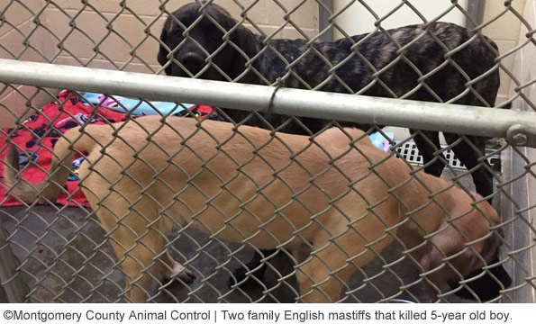 Child John Doe, 5-years old, was killed by his family's two English mastiffs. Clarksville emergency personnel responded to a home in the 1000 block of Charles Thomas Road at about 8:20 am for a report of a dog attack. They discovered the boy with "extensive injuries" after being mauled by the dogs. The child was transported to Tennova Medical Center where he died from his injuries. Both dogs were taken into custody by Montgomery County Animal Control. Police said both dogs were under a year old. Later news reports stated 6-months old. Montgomery County Animal Control released a photograph of the dogs being held in quarantine. Clarksville Police Lieutenant Steve Warren said, "Our hearts certainly go out to that family, and to the first responders, it was a tough call for them too." Police opened an investigation into the dog attack. News footage of the home on Charles Thomas Road, a new subdivision, showed high fencing around the victim's backyard. No additional information, including the identity of the child, was released. [source citations]