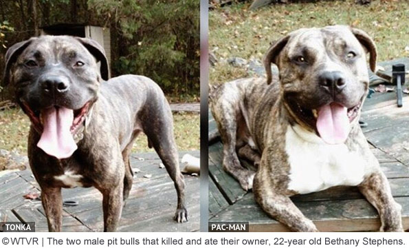 Bethany Stephens, 22-years old, was attacked and killed by her two pit bulls. The dogs later fed on her corpse. About 8:15 pm, Goochland County sheriff's deputies discovered her dismembered body in the 2200 block of Manakin Road. She had been dead for at least a day. "It was an absolutely grisly mauling. In my 40 years of law enforcement, I've never seen anything quite like it. Hope I never see anything like it again," Goochland County Sheriff James Agnew said during his first press conference. After her death, rumors flared on social media, bolstered by media reports echoing them, claiming she was murdered or attacked by a bear. Agnew had to give a second press conference to end the rumors. The two pit bulls, Tonka and Pacman, were 2.5 year old males and came from the same litter, though Bethany had only acquired Pacman about 1.5 years ago. Several weeks prior to her death, she had been keeping the dogs in outdoor kennels at her father's home, stopping by to visit and feed them about five days per week. Previously, they had been indoor dogs. [source citations]