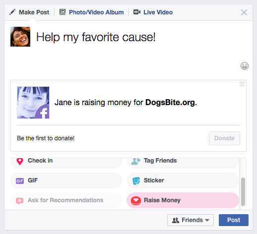 Any person who has a Facebook account can raise funds for our nonprofit. Simply go here and start raising funds. You can also add the Raise Money button to a new post on your Timeline. This option is a few choices below the add Photo/Video button. Scroll down to Raise Money and select it (red heart icon). When the search box appears, type in DogsBite.org. Then at the bottom of your post, it will say, "[Your name] is raising money for DogsBite.org," along with a donate button.